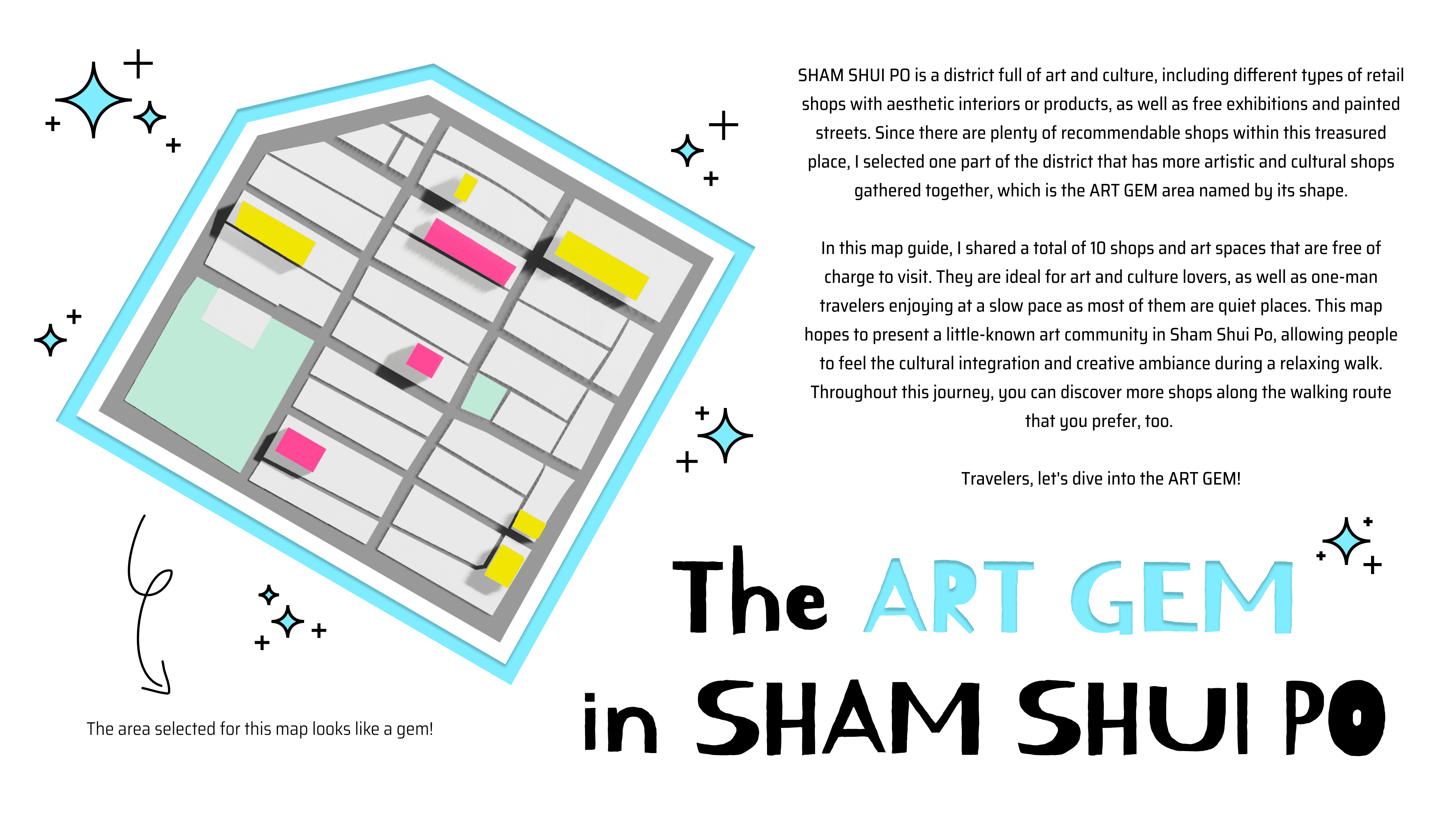 Photographs and map graphics introduce the exploration and personal experience in a local area within one of Hong Kong's districts.